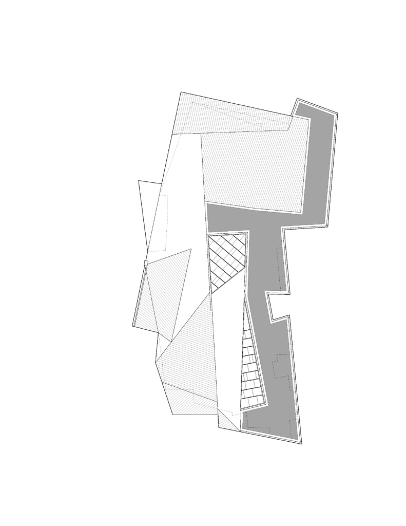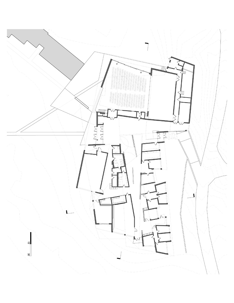 We were acutely sensitive to minimizing the building’s potential impact as an ungainly intruder. To reduce the appearance of its scale and volume, the building is sited snug against a hill, in a way that preserves the campus and defines open spaces to the east and west. The folded and fragmented roof reflects the impulse and desire to diminish the overall mass in an organic composition. Building forms are embedded topographically into the site and the aggregate massing alludes to the historic massing of New England farmhouses, successfully reducing the scale and impact of the building.